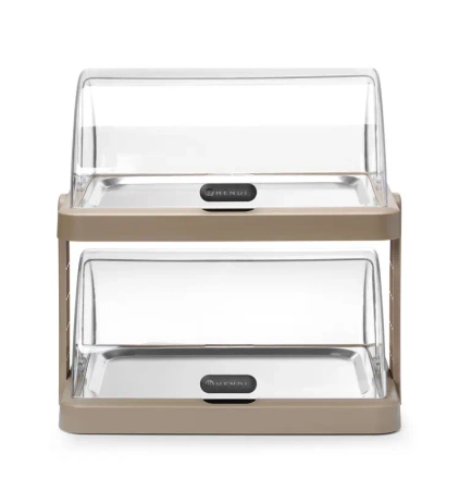 - Construcție verticală cu tavă dublă – permite prezentarea unui număr mai mare de preparate pe un spațiu redus, ceea ce este deosebit de util în locațiile cu blat limitat sau la evenimente cu o ofertă culinară diversificată.