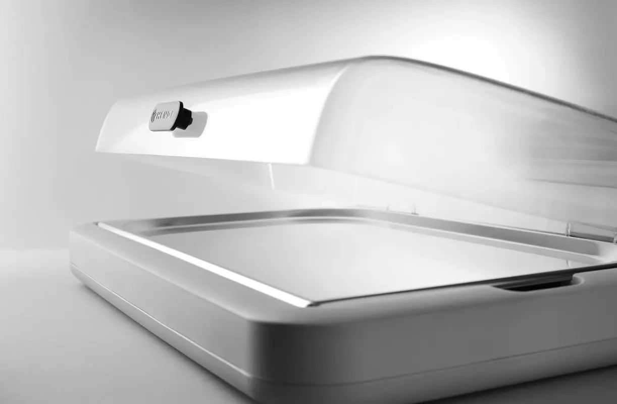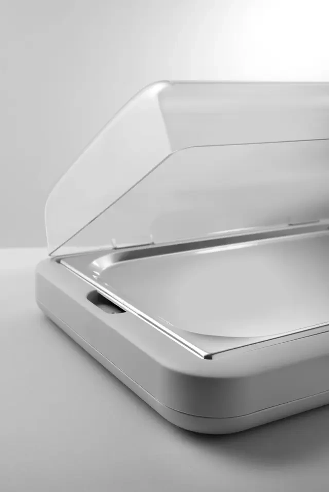 - Ușurință la menținerea igienei – Carcasa din polipropilenă durabilă, precum și montajul și demontajul rapid, permit curățarea eficientă și pregătirea vitrinei pentru următoarea utilizare. Capacul roll-top, cu deschidere la 90 de grade, asigură alimentarea și schimbarea facilă a preparatelor.