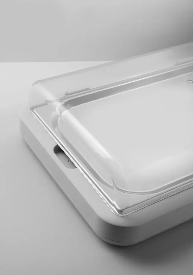 - Soluții practice pentru gastronomie – Decupajul din carcasă permite scoaterea facilă a tăvii, iar marginile ergonomice facilitează transportul vitrinei, chiar și în timpul muncii intense la bufet sau la evenimente de catering.