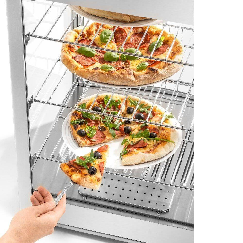 Trei rafturi reglabile de 40x33,5 cm permit depozitarea pizzelor de diferite diametre sau a altor alimente, cum ar fi aluatul sau gustările. Posibilitatea de a schimba poziția rafturilor în trepte de 2 cm face ca afișajul să fie universal și ușor adaptabil la nevoile spațiilor. Această capacitate permite gestionarea eficientă a sortimentului, ceea ce este deosebit de important în perioadele de vârf.