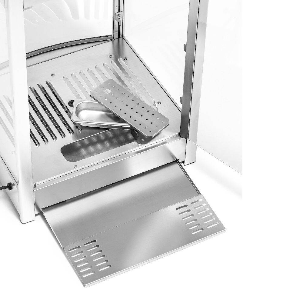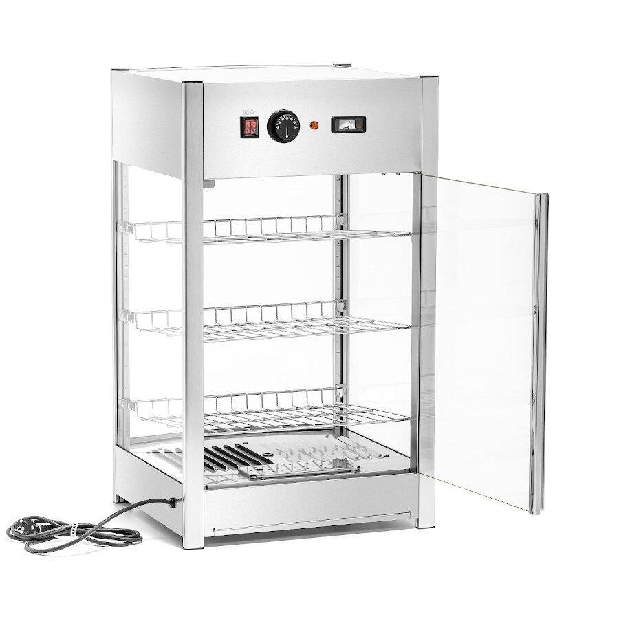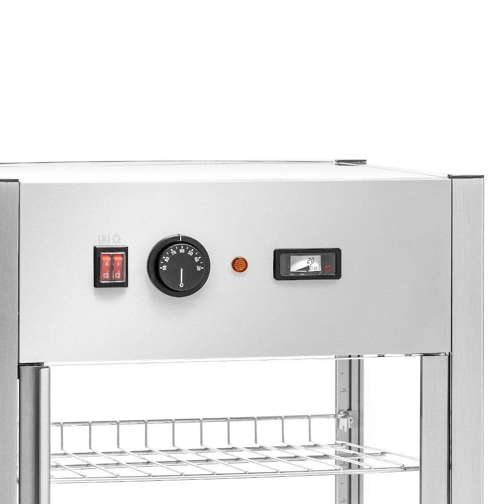 Acesta este prevăzut cu trei rafturi reglabile pe înălțime, iluminare cu LED-uri în partea superioară a compartimentului și o ușă cu balamale în spate care facilitează semnificativ utilizarea unității. Vitrina are un panou intuitiv de control al temperaturii, care vă permite să adaptați rapid condițiile de încălzire la tipul de alimente depozitate.