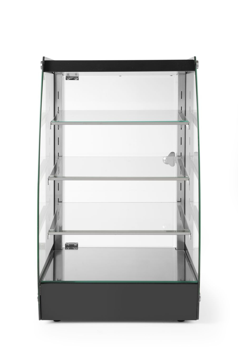 Alimentarea la 230 V și construcția compactă fac ca vitrina să poată fi amplasată practic oriunde. Iluminare LED montată în partea superioară, controlată de un comutator iluminat. Carcasa este realizată din oțel inoxidabil și sticlă securizată, sigură. Geamurile laterale au grosimea de 5 mm. Lipsa geamului frontal permite autoservirea. Nișă practică în partea de jos cu dimensiuni de 26x32x8,5 cm, de exemplu pentru stocul de produse prezentate. 3 rafturi de sticlă reglabile, înclinare ușoară spre client. 8 poziții posibile pentru rafturi.