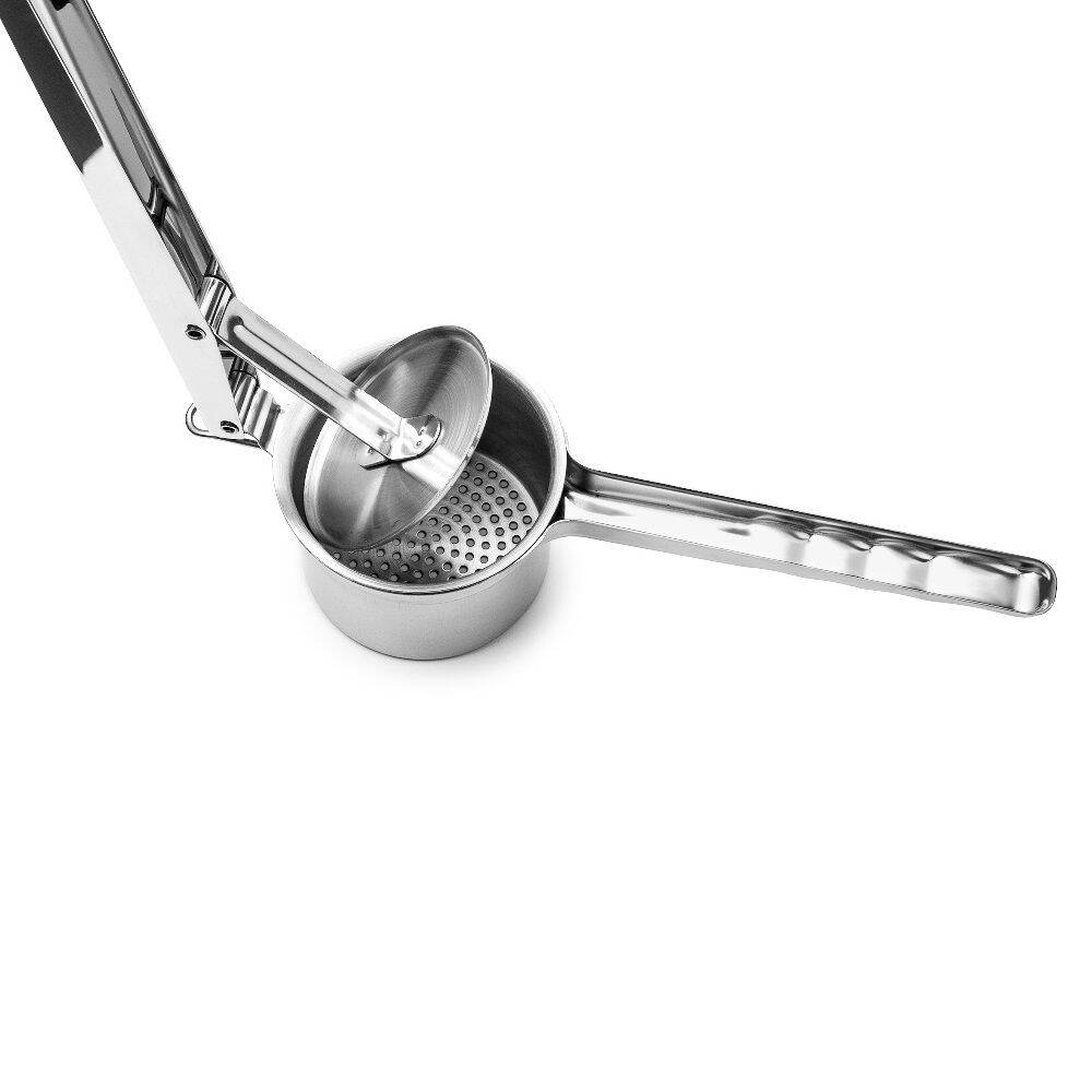 - Mânere ergonomice – lungimea mânerelor de 28 cm asigură o prindere confortabilă și sigură, facilitând presarea chiar și a unor cantități mari de cartofi sau alte ingrediente. Presa este potrivită pentru utilizare zilnică și intensă în gastronomie.